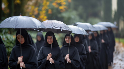 A devout nun with a serene expression illuminates votive candles in a dimly lit church, symbolizing faith, prayer, and spiritual devotion in a sacred space.