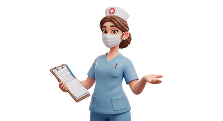 Cartoon nurse wearing mask with clipboard presenting information, conveys medical expertise and care, ideal for healthcare campaigns and educational content about wellness