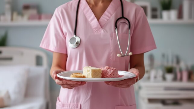 A compassionate nurse holds a plate of delicious desserts, symbolizing care and comfort in a healthcare setting, showcasing the human side of medical professionalism.