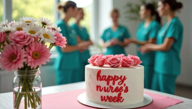 Nurse Week celebration with cake, flowers. Nurses in scrubs gathered in background. White cake decorated with pink roses, red lettering saying happy nurse week. Healthcare professionals honored with