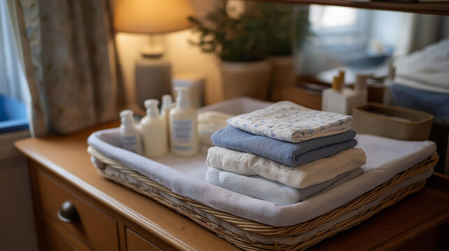 A cozy nursery scene with a changing table featuring lotion, powder, and clean diapers neatly organized for quick access during diaper changes. Soft colors create a welcoming and practical