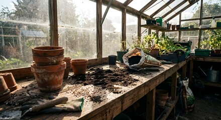 Authentic wooden potting bench covered in wet soil and gritty terracotta pots
