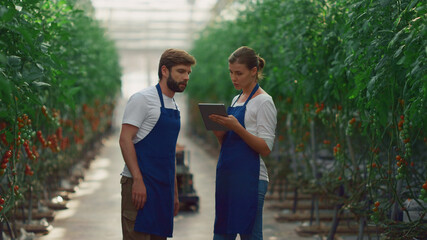 Couple agronomists monitoring tomato harvest production in greenhouse plantation