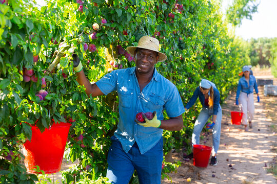 Hardworking african american male farmer working in a fruit nursery plucks ripe plums from a tree, putting the fruits in a ..bucket