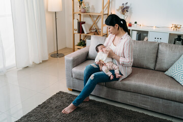 asian new mother sitting on couch is nursing her infant daughter with bottled milk on tranquil morning in modern cozy home living room interior with daylight.