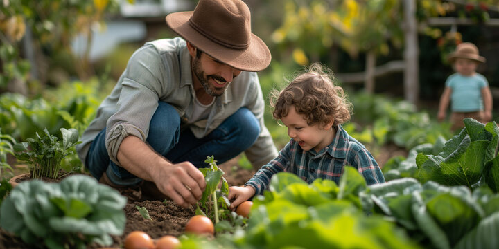 Gardener family in garden and growing and planting,. Happy family engaged in organic farming with fresh vegetables in garden