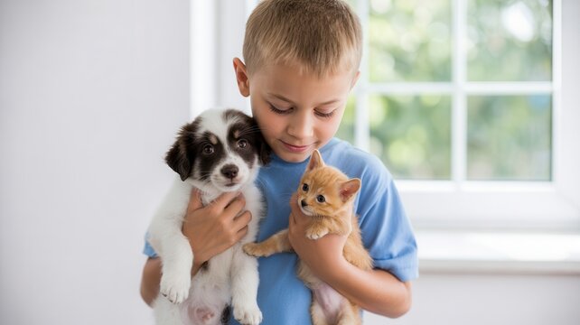 A little boy tenderly holding a fluffy brown and white puppy and a small ginger kitten in a bright home environment.