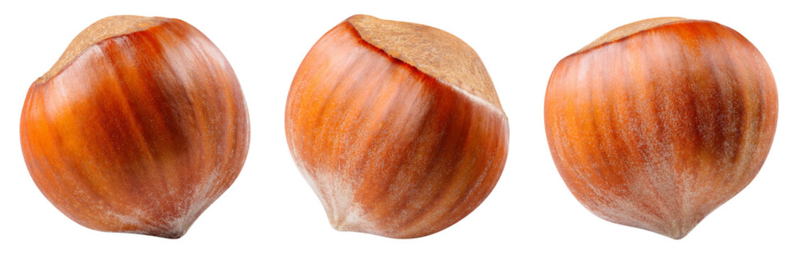 Hazelnut isolated png. Unpeeled hazelnut on white or transparent background. Perfect retouched forest filbert nut with shell no background. Transparent png collection. Full depth of field.