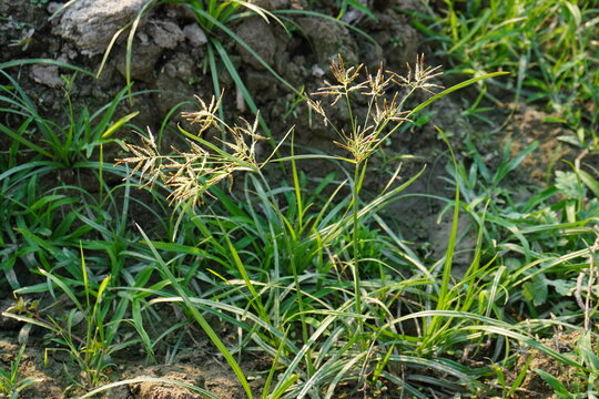 The nutgrass along with its seed heads on the soil