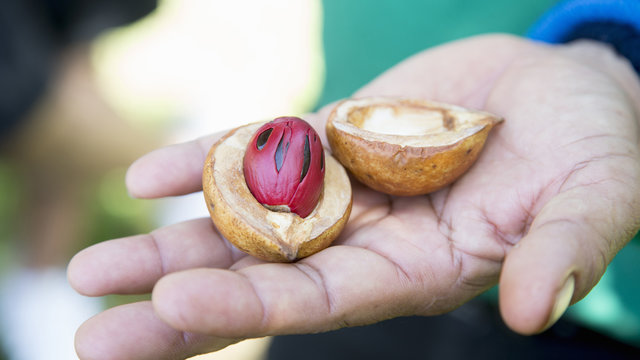 Fresh nutmeg fruit and cut in half  isolated on white background. Clipping path.