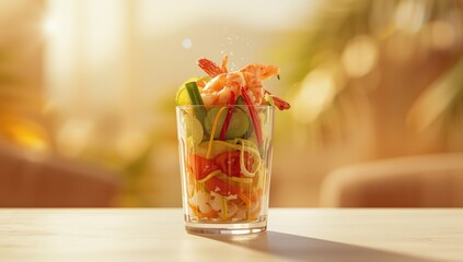 A fresh vegetable salad topped with shrimp presented in a clear glass, ideal for a nutritious snack or starter, World Nutrition Week
