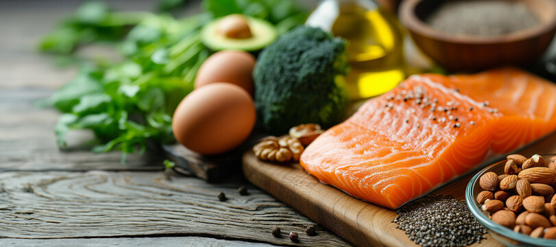 foods rich in omega 3. red fish steak, olive oil, avocado, walnuts, eggs, flax seeds and chia seeds, broccoli. healthy eating concept. nutritional value of foods. selective focus