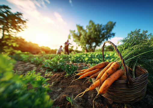 AI generator images of field of carrots (Daucus carota subsp. sativus) with freshly harvested carrots placed in baskets. Carrots are an easy-to-grow crop with high nutritional value.