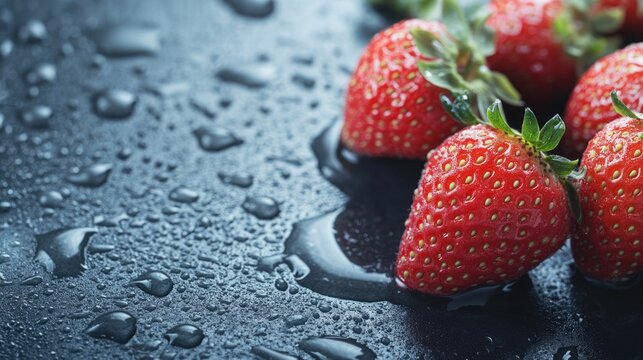 Fresh strawberries glistening with water droplets on a dark surface with ample copyspace for text or design elements