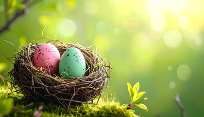 A close-up of a bird's nest nestled on moss with two speckled eggs inside, set against a blurred green backdrop. Sunlight filters in