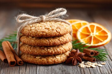 Stack of oatmeal cookies wrapped with ribbon on wooden table