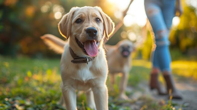Labrador dog obediently follows commands alongside its owner during a relaxing walk in a park setting amidst autumn scenery