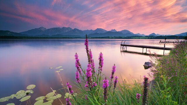 Gorgeous mountain scenery in the Bavarian Alps. Scenic image of nature landscape during sunset. Alpine village of Berchtesgaden and Watzmann massif with colorful sky. Popular travel destination