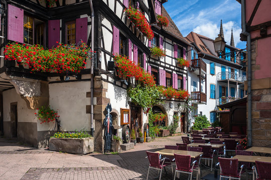 Oberai, France - August 11, 2014: Beautiful half-timbered houses in the historic center of Obernai in Alsace. Obernai is one of the most beautiful town on the wine route in Alsace, France