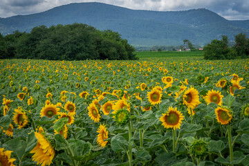 Obernai, France - 06 26 2025: Detail view of a field of sunflower flowers along the wine route with hills and under a sunny and cloudy sky