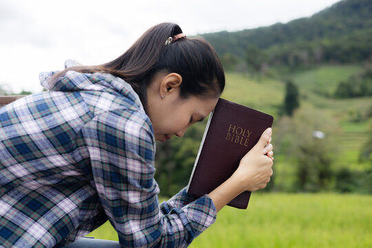 Human praying on the holy bible in a field during beautiful sunset.