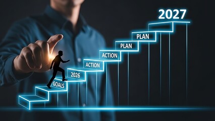 Man's hand points to glowing stairs with 2027 year and steps labeled goals action plan pointing