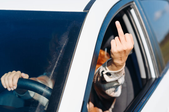 young woman driver gives middle finger to another driver, making obscene gesture, rudeness on roads, road rage concept