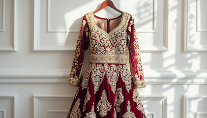 Luxurious wedding gown displayed in opulent mansion hallway.