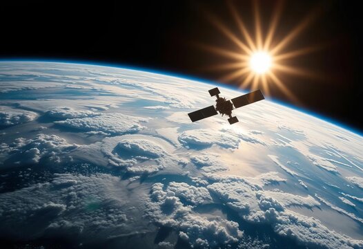 Satellite orbiting Earth, sunlit clouds, weather patterns, climate change visible, climate change, pressure