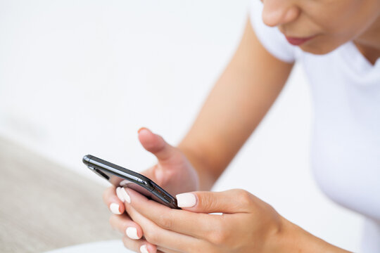 Woman Sleeping In Bed Wearing Wireless Earphones Connected To Mobile Phone