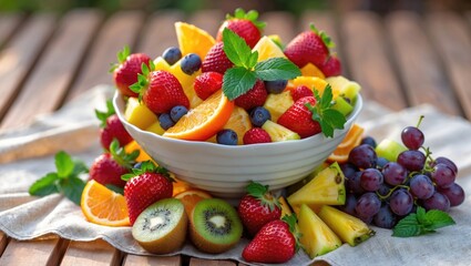 Vibrant fresh fruit salad bursting with strawberries, kiwi, oranges, and grapes, a healthy and delicious treat for any occasion