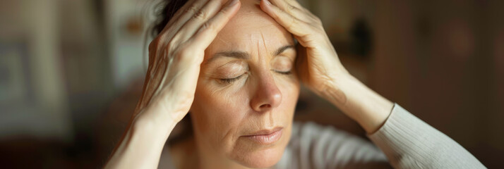 Headache or migraine pain, suffering from vertigo, holding head with hand, health problems of the brain, inner ear, not balance, headache, and stress with thinking