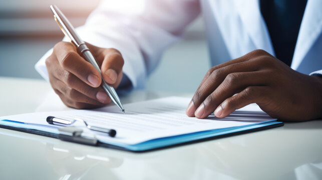 Doctor taking notes on clipboard during discussion with medical team involved in collaborative patient care, documentation, and health care strategy development in clinic