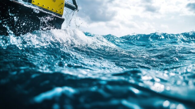 Undersea Connection, fiber optic cable deployment from a ship, ocean depths, blurred maritime equipment, technological advancement in communication
