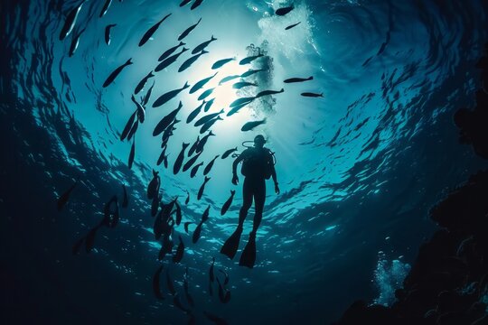 A professional diver scuba swimming and observing fishes and corals in a blue ocean with a fascinating reef view. Generative AI.