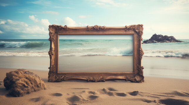 Vintage ornate picture frame standing on a sandy beach with ocean waves in the background.