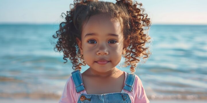 With family on vacation, young girl at beach with ocean view. Enjoying summer vacations with kids in nature, at the beach, and building childhood memories.