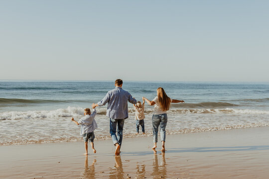 Happy family of four people with small kids walking and having fun near the ocean on the sunny beach during a weekend travel vacation