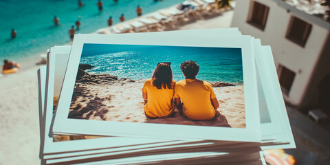 Stack of photos showing couple sitting on sandy beach, ocean background. Represents travel memories, summer vacation, couple's love