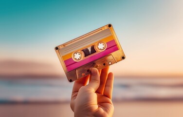 Hand holding translucent audio cassette against a vibrant sunset sky with ocean backdrop, evoking nostalgia and tranquility