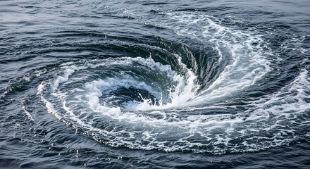 Powerful ocean whirlpool vortex with swirling water and foam