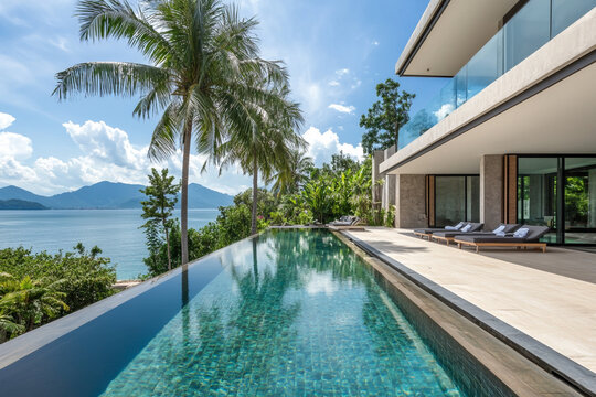 Luxurious oceanfront villa with infinity pool and stunning mountain view, destination vacation concept