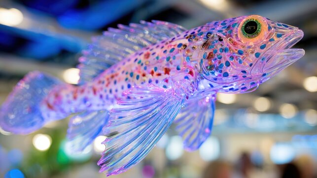 Colorful glass fish hangs in a display at an art exhibit showing marine life