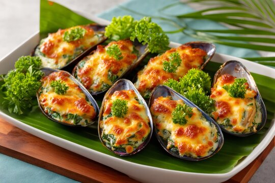 Baked mussels with cheese and parsley topping on a banana leaf