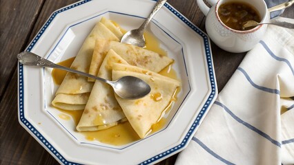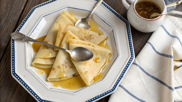 Delicious Breakfast. Folded Crepes on Octagonal Plate