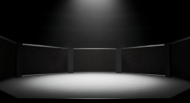 An empty, octagonal mixed martial arts cage, lit by overhead spotlights, sits in a dark, industrial-style room, promoting combat sports imagery
