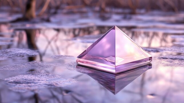 A large, glowing crystal in the shape of an octahedron hovers over frozen water, surrounded by rocks, set against a dark starry night in a magical art nouveau style