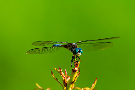 A close up isolated image of a vibrant colored blue dasher dragonfly (Pachydiplax longipennis) on a stick. This side view photo shows color gradients in wings and stripes on thorax.