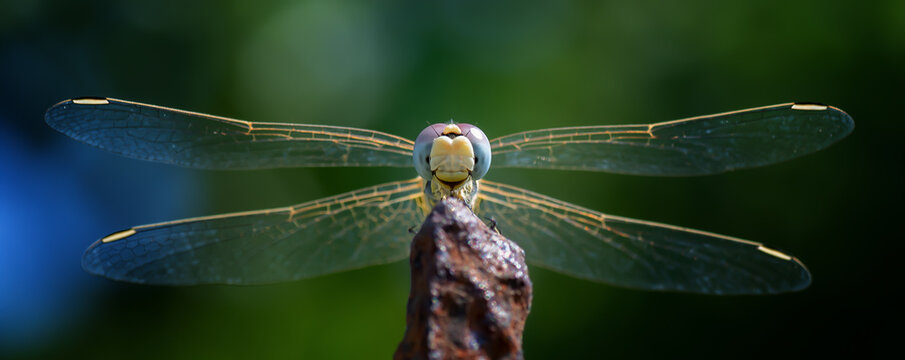 Front view of dragonfly isolated on blurred background