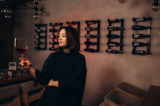 Woman doing wine tasting, drinking glass of chardonnay or sauvignon blanc in winery cellar amongst barrels on vineyard. Beautiful oenologist or sommelier enjoying a relaxing, luxury beverage indoors.